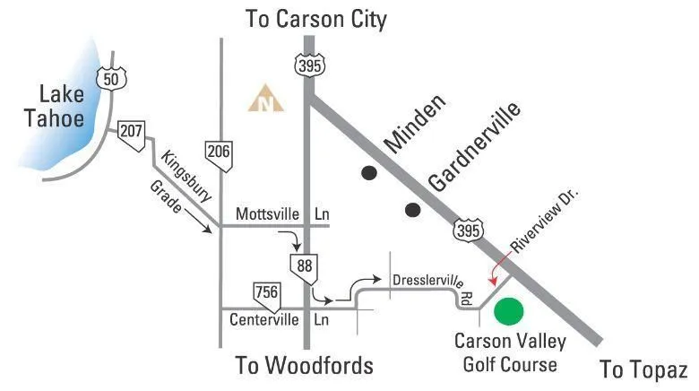 The golf course is a very pretty 25-minute drive from South Lake Tahoe. Once a well-kept secret, the word is out, Carson Valley is a great place to live and play. Did we mention the beautiful views of the Sierras from the golf course, yes the Sierra Nevada mountains at Lake Tahoe, we get to enjoy their purple mountain majesty every day.